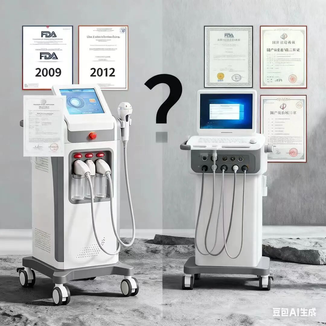 但实际情况是什么呢?这些国产超声设备都是按第二类医疗器械获批的。它们拿着治疗肩颈疼痛的批文,却被用来做面部抗衰项目。
